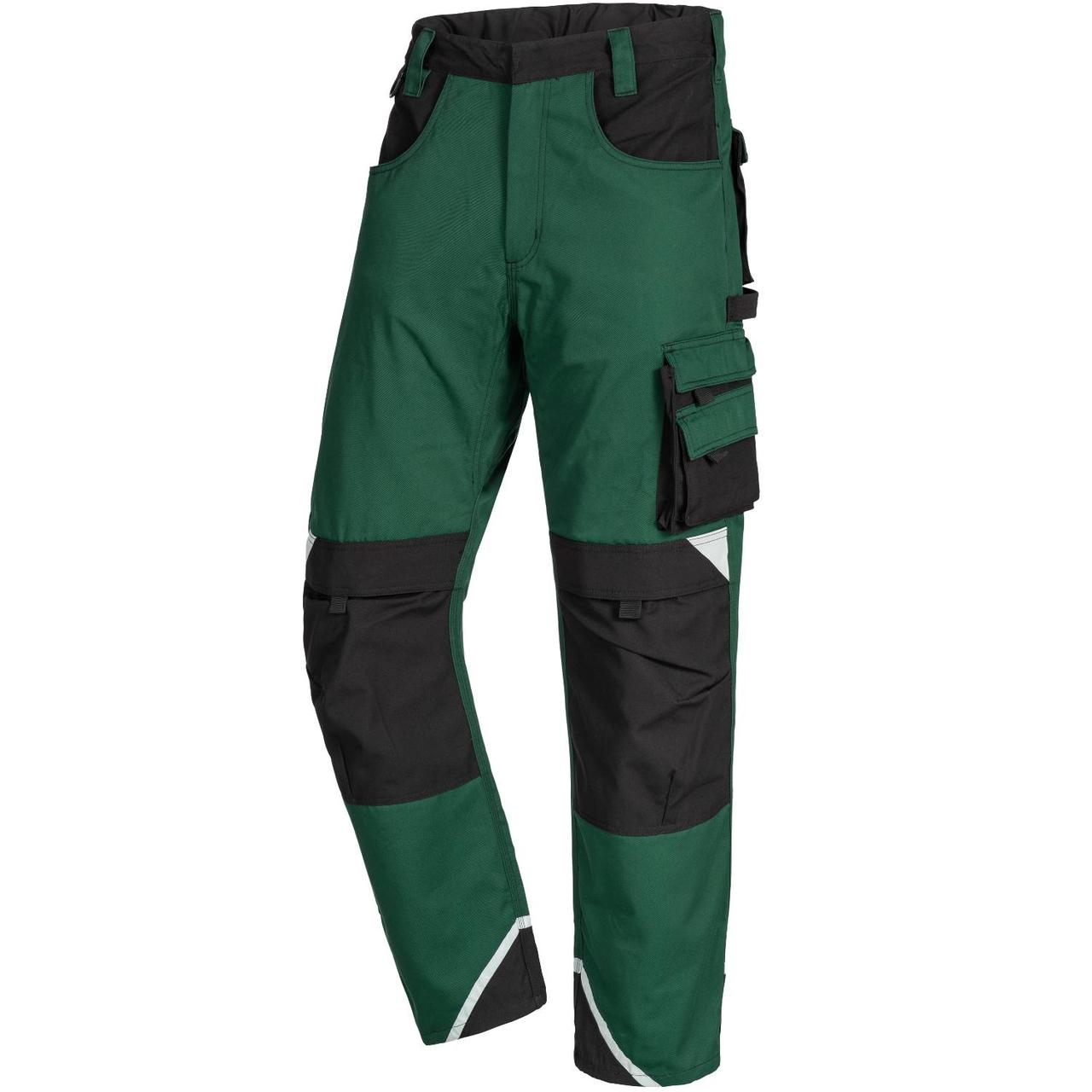 NITRAS MOTION TEX PLUS, длинные рабочие брюки, зеленый/черный, 280 г/м², дышащий материал, высокий комфорт при ношении, эластичная талия с приподнятой спинкой, усиление на петле для ремня сзади и усиления из Canvas на спине, коленях, карманах на штанинах и лодыжках, прочные тройные швы, закрытая пуговица для защиты продукта (например, от царапин), светоотражающие элементы для лучшей видимости, практичные и полезные дополнения: карманы на бедрах с клапанами, карман для линейки с дополнительным карманом, карманы на коленях для протекторов со вставкой сверху, петля для молотка, D-образное кольцо, OEKO-TEX STANDARD 100®, Comfort Fit, опционально доступны наколенники 76K (EN 14404)