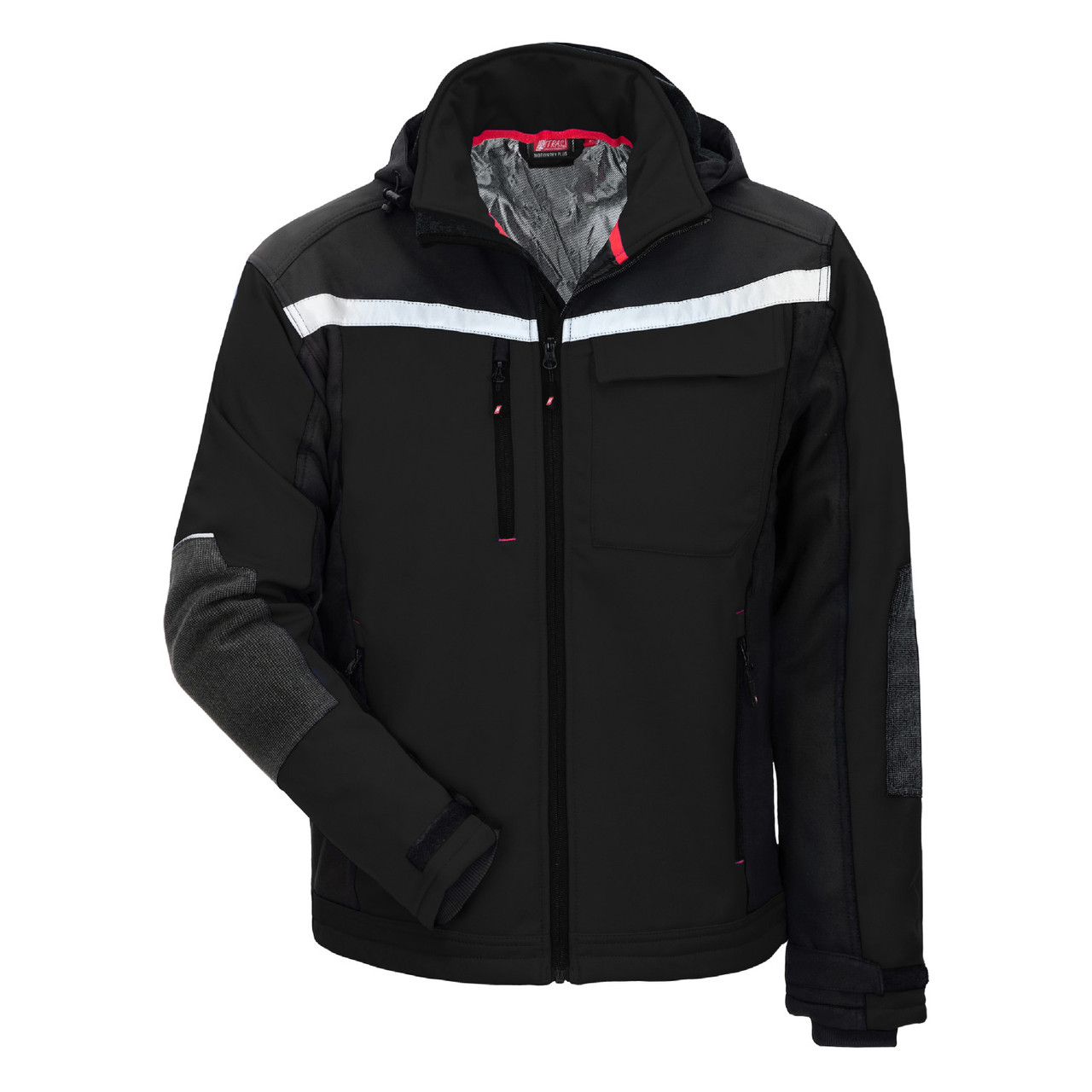 NITRAS MOTION TEX PLUS, куртка softshell, черная, 340 г/м², высокий комфорт при ношении благодаря мягкому материалу softshell с водоотталкивающими и ветрозащитными свойствами и удлиненной спинке, регулируемые манжеты с застежкой-липучкой и талией на шнурке для оптимальной посадки, теплоизолирующая подкладка, усиленные локти для высокой прочности, светоотражающие элементы на груди и светоотражающая окантовка на задней части рукава, а также на спине для лучшей видимости, воротник-стойка, непрерывная молния YKK с защитой подбородка и ветрозащитой внутри, нагрудные, внутренние и боковые карманы, запястье для низких температур, съемный капюшон со шнурком для фиксации, Comfort Fit.